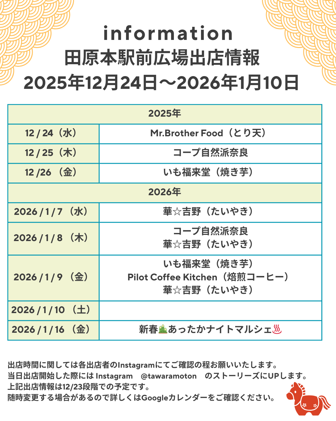 25/12/28 [パンフレット]【年末のご挨拶】 25/12/24 [パンフレット]田原本駅前広場出店情報 12月24日~1月10日まで 25/12/23 [パンフレット]「灯りの路と大とんど」開催 2026 年 1 月 11 日(日曜日) 25/12/18 [お知らせ]唐古・鍵考古学ミュージアム 令和8年度ミュージアムサポーターズを募集 25/12/12 [スポット・商品紹介]田原本町のいちご農園ハッピーイチゴランドのご紹介 25/11/27 [お知らせ]「ナウル屋田原本町出張所」が2025/11/28「観光ステーション磯城の里」にOPEN