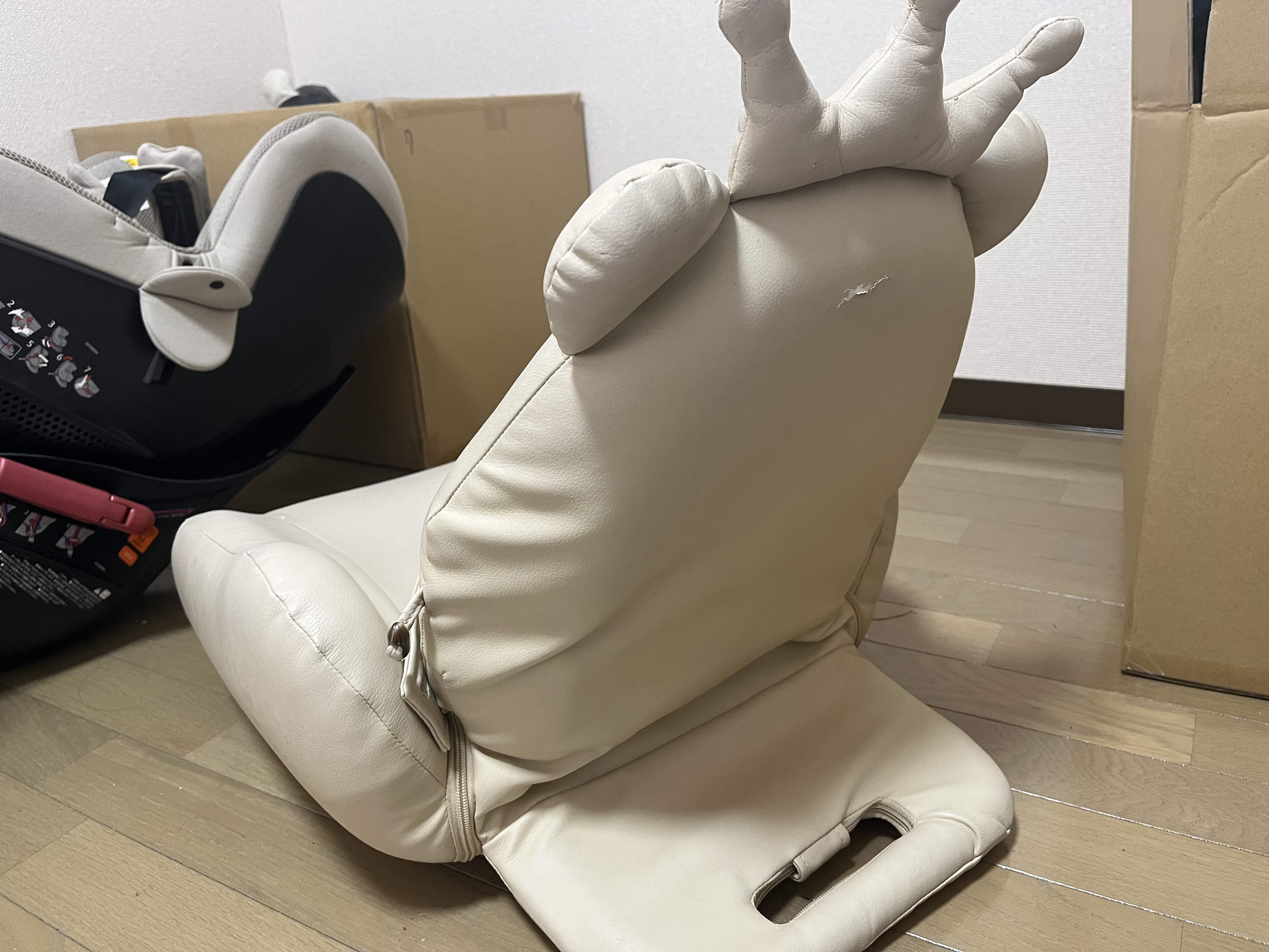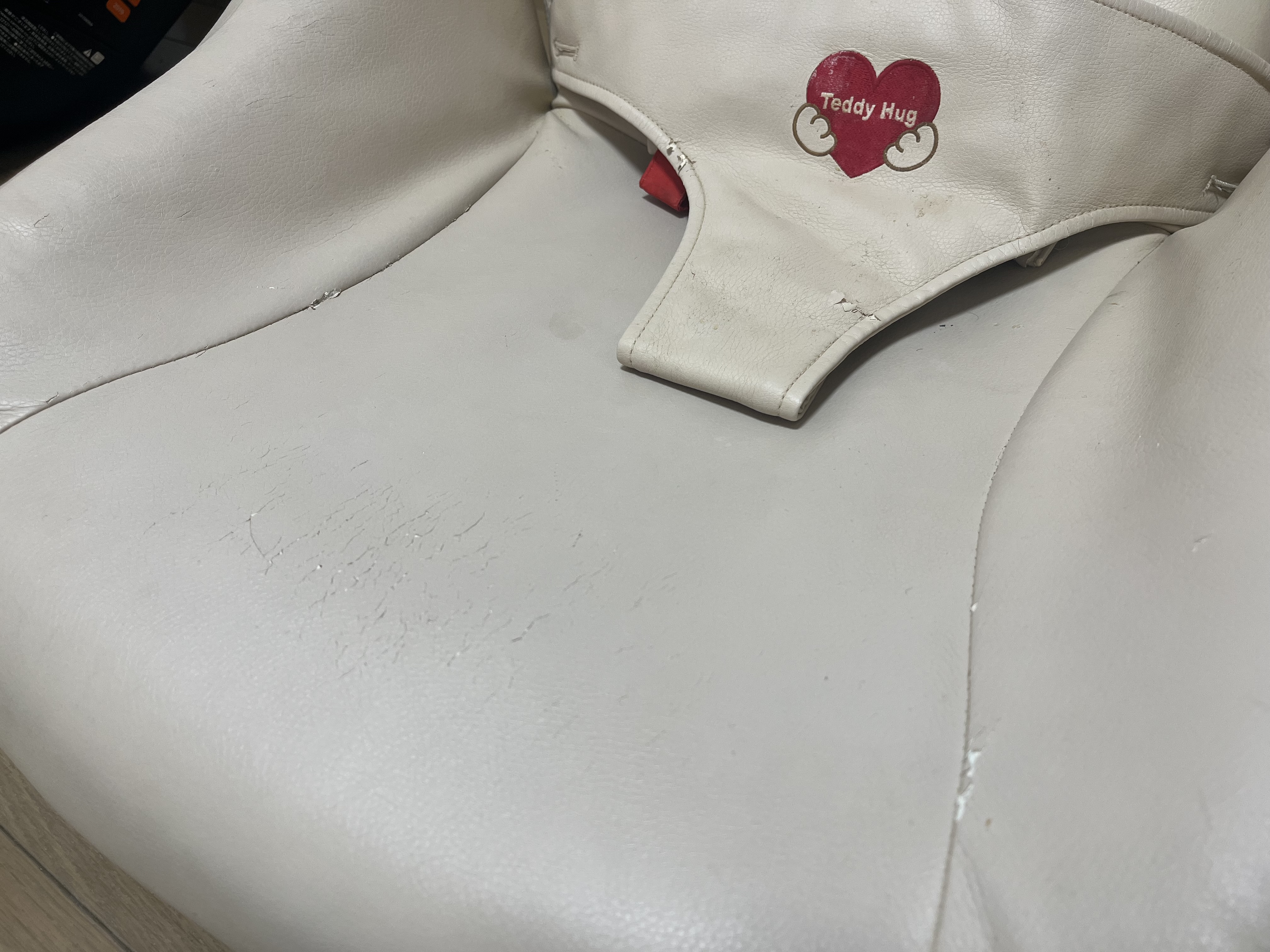 2か所、シールをはがした後がありますが、ほぼわかりません。フックの釘の穴が1ヵ所あります。イス背もたれの支え部分のカバーが一部破損しています(写真)